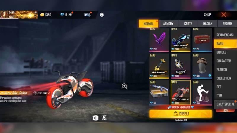 Terakhir, kita akan membahas cara mendapatkan skin motor yang keren ini nih. Kamu bisa mendapatkan skin motor yang satu ini melalui menu Shop.
