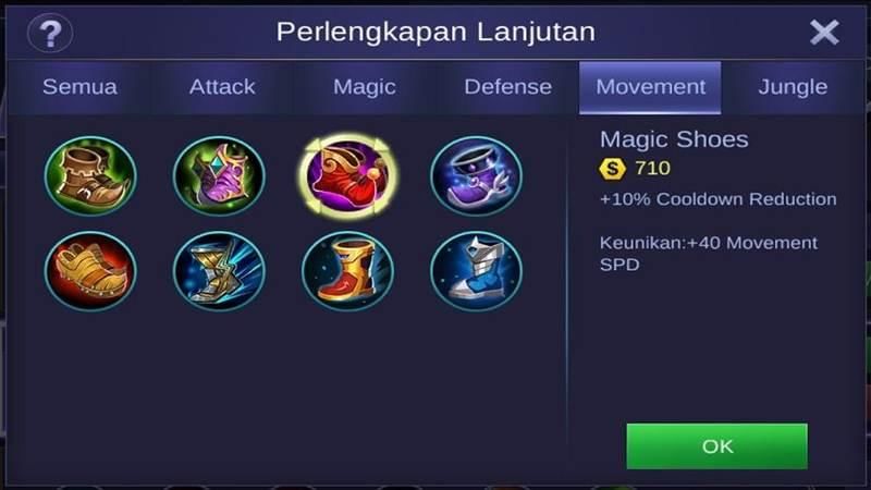 Pertama, kalian bisa memilih item Magic Shoes. Kelebihan dari item ini yakni, bisa memberikan tambahan +10% cooldown reduction dan atribut +40 movement speed untuk Harley.