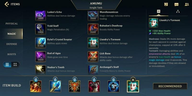 Guna membuat Amumu jadi lebih kuat dan mengerikan, item Sunfire Cape, Rylai’s Crystal Scepter dan Thornmail sangat wajib untuk digunakan.