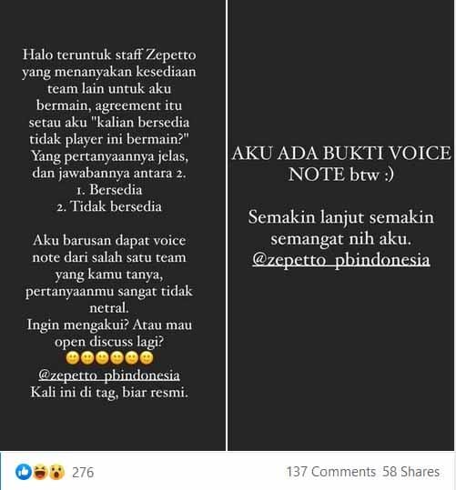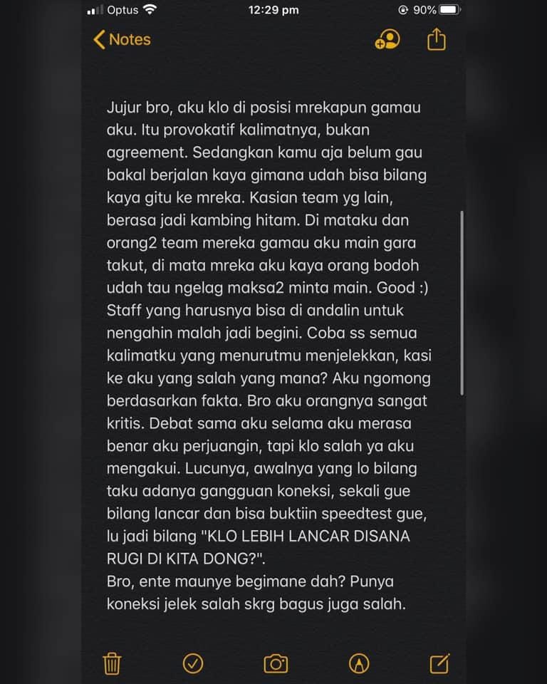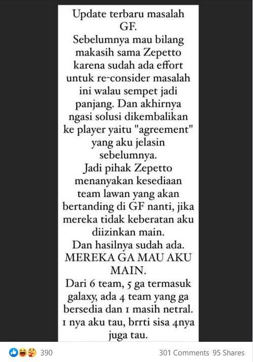 Melalui beberapa postingan yang ada di media sosial miliknya, pro player Point Blank tersebut membagikan perkembangan serta proses yang sudah terjadi dan alasan hingga dirinya dilarang bertanding.
